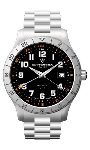 Since founded in 1858, Catorex has captured tradition and adapted to the style of the day. With Catorex wristwatches, time acquires a very different meaning in the modern world. Unceasingly creating new types of watches this voyager 3 watch has personality, taste and adorns the wrists of the most demanding clientele. The round stainless steel case creates cultivated expression as it frames the sophisticated black dial featuring: 24-hour time display, date display, orange luminous hands and numbers and second hand feature. Equipped with a stainless steel bracelet, fold-over-clasp-with-double-push-button-safety, protective sapphire crystal window, eta 2893-2 swiss automatic movement, exhibition case, screw down crown and 330 feet water resistance, this classic timepiece acquires international fame, for all Catorex products are manufactured with the "savoir-faire" of professional watchmakers.